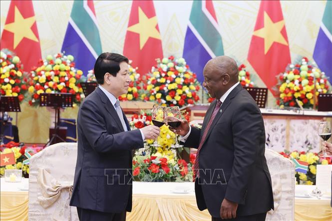 State President hosts banquet for South African counterpart 10/23/2025 23:03 | TTXVN Prime Minister meets South African President Official welcome ceremony held for Vietnamese Party chief in Bulgaria President chairs rehearsal for signing ceremony of Hanoi Convention Vietnamese Party chief lands in Bulgaria to bolster ties Party chief visits Aalto University, meets Vietnamese students in Finland