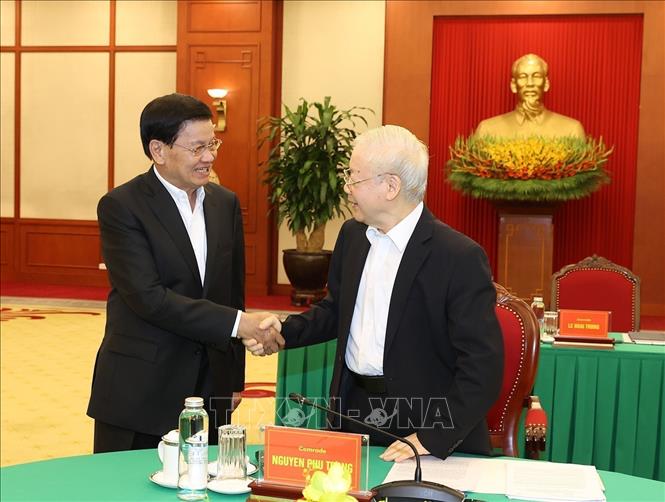 General Secretary of the Communist Party of Vietnam Nguyen Phu Trong and General Secretary of the Lao People’s Revolutionary Party and President of Laos Thongloun Sisoulith. VNA Photo: Trí Dũng