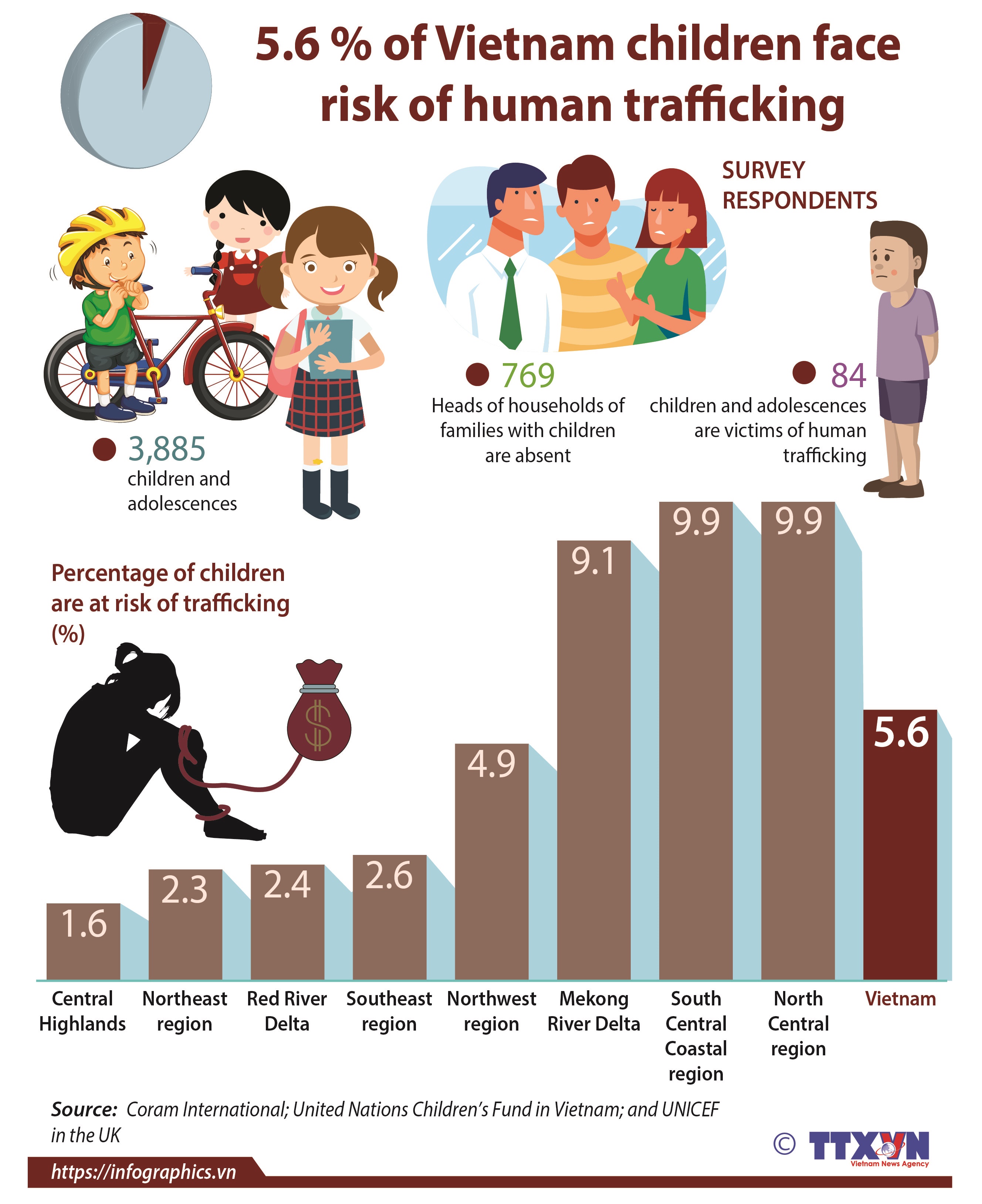 Infographic 5.6 % of Vietnam children face risk of human trafficking 5.6 % of Vietnam children face risk of human trafficking Date:08/15/2019 09:55 Format:.jpg Category:Culture Download: Tags:Vietnam, Vietnamplus, children, human trafficking, UNICEF Share:Plugin Social