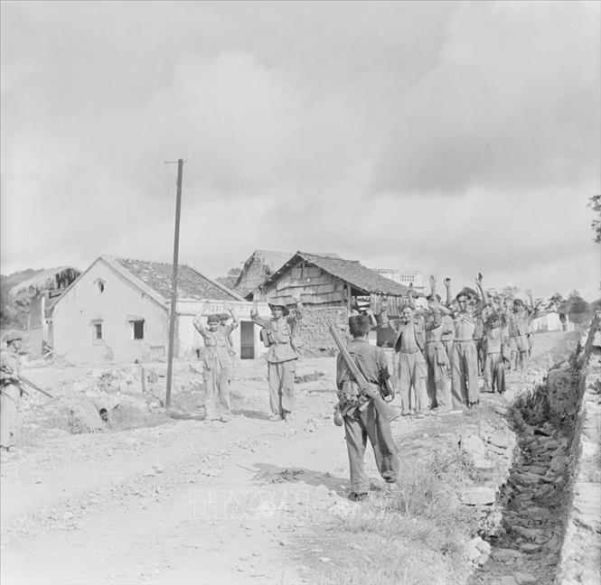 Trong Chiến dịch biên giới, ta đã loại khỏi vòng chiến đấu gần 10 tiểu đoàn địch (có 8 tiểu đoàn Âu - Phi, chiếm 41% lực lượng cơ động chiến lược của Pháp ở Đông Dương), diệt và bắt 8.296 tên, thu hơn 3.000 tấn vũ khí và đồ dùng quân sự, xóa sổ Liên khu biên giới Đông Bắc của địch. Trong ảnh: Quân địch ở Thất Khê ra hàng bộ đội ta trong Chiến dịch biên giới 1950. Ảnh: TTXVN