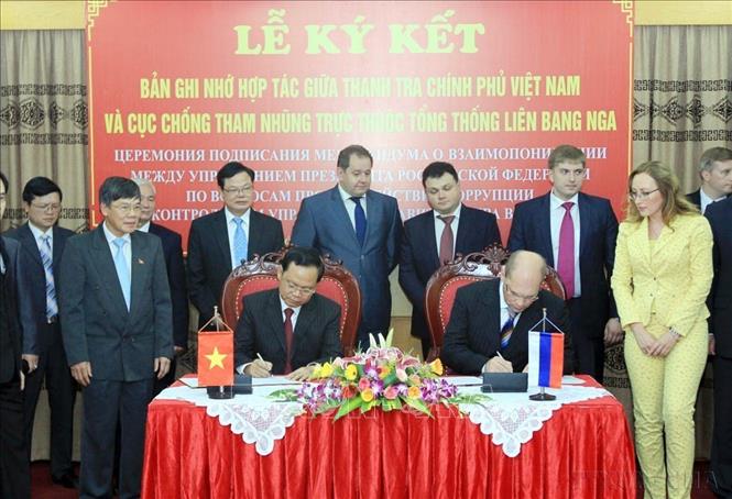 Tổng thanh tra chính phủ Huỳnh Phong Tranh và Cục trưởng cục chống tham nhũng trực thuộc tổng thống LB Nga Plokhoi Oleg Anatolevich ký bản ghi nhớ giữa hai đơn vị (Hà Nội, 23/9/2014). Ảnh: An Đăng – TTXVN