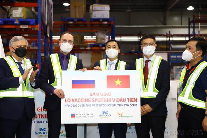 Đại sứ LB Nga tại Việt Nam Gennady Bezdetko bàn giao lô vaccine Sputnik V đầu tiên cho Thứ trưởng Bộ Y tế Trần Văn Thuấn. Đây là lô vaccine do Quỹ Đầu tư trực tiếp Nga cung cấp cho Việt Nam (Hà Nội, 29/9/2021). Ảnh: Huy Hùng - TTXVN