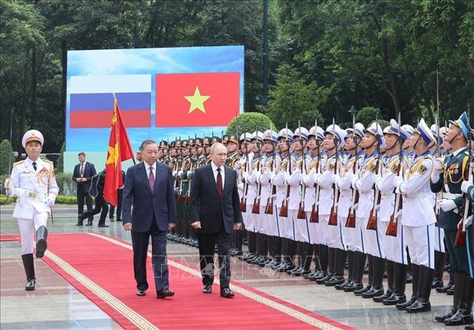 Chủ tịch nước Tô Lâm chủ trì Lễ đón chính thức Tổng thống Liên bang Nga Vladimir Vladimirovich Putin thăm cấp Nhà nước tới Việt Nam theo lời mời của Tổng Bí thư Nguyễn Phú Trọng, từ ngày 19-20/6/2024. Ảnh: TTXVN