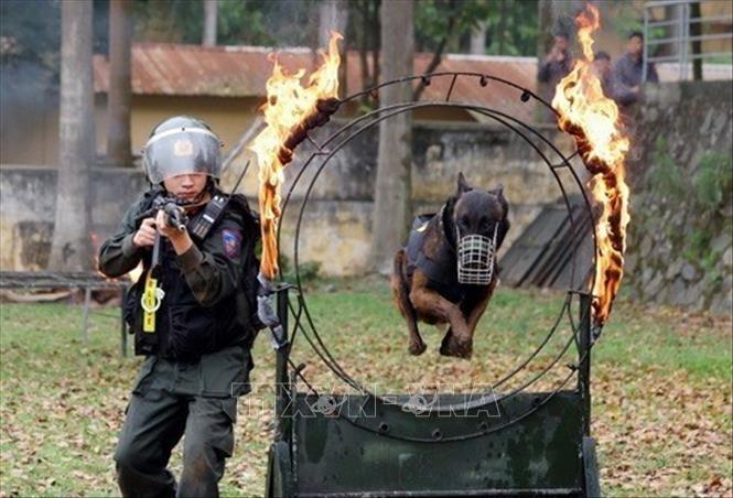 Chó nghiệp vụ tham gia truy bắt, khống chế tội phạm cùng lực lượng Cảnh sát cơ động trong tình huống giả định. Ảnh: Phạm Kiên - TTXVN
