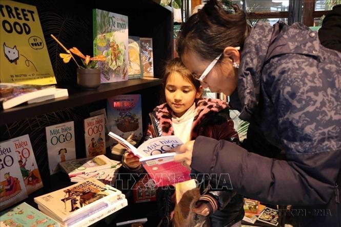 "Tủ sách Việt trong nhà hàng Việt" do Kênh Việt Happiness Station phối hợp với Tổng hội người Việt Nam tại Bỉ thực hiện, nhằm lan tỏa tình yêu tiếng Việt tới bạn bè quốc tế. Ảnh: Hương Giang - TTXVN