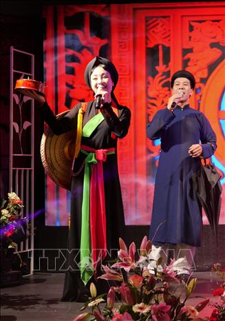 Một tiết mục biểu diễn trong chương trình nghệ thuật “Văn hoá Việt Nam – Tinh hoa di sản Kinh Bắc” của Nhà hát Dân ca Quan họ Bắc Ninh tại Berlin. Ảnh: Thu Hằng - Pv TTXVN tại Đức