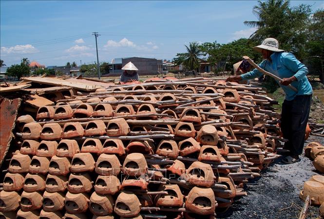 Go pottery of the Cham ethnic people in Binh Duc village (Phan Hiep commune, Bac Binh district of the central province of Binh Thuan) is known as handmade products with unique natural colors and patterns. The name of Go pottery is derived from the word "Gok", which means pot in Cham language. Cham pottery products are mainly household utensils, worship objects, and handicrafts such as jars (called “jek”), pots (gok), food trays (cambak), and vases (bilaok), demonstrating the skills and the creativity of Cham women. The finished pottery products have a light red color with special and natural patterns, making them distinctive from items made by other localities. In late 2022, the art of pottery making of Cham ethnic people was inscribed in the list of intangible cultural heritages in need of urgent safeguarding by the United Nations Educational, Scientific and Cultural Organization (UNESCO). VNA Photo: Hồng Đạt