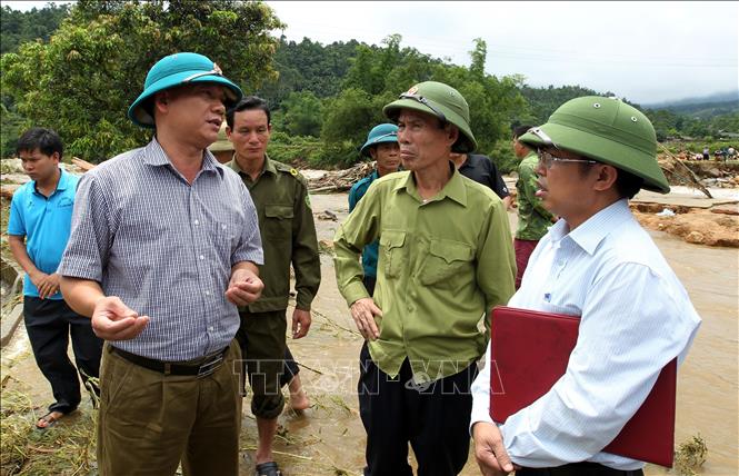 Trong ảnh: Phó Chủ tịch UBND tỉnh Lào Cai Nguyễn Hữu Thể dẫn đầu đoàn công tác đến thăm, kiểm tra tình hính khắc phục sau mưa lũ gây ra tại xã Khánh Yên Hạ, huyện Văn Bàn. Ảnh: Quốc Khánh - TTXVN