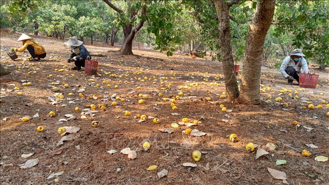 [03/04/2023 18:22:56] Do mưa liên tục vào những ngày đầu tháng 4, giá thu mua hạt điều tươi tại Bình Phước giảm sâu từ 25.000 đồng/kg xuống còn 22.000 đồng/kg khiến người dân đang trong vụ thu hoạch kém vui. Bên cạnh đó, các hộ dân “thủ phủ” điều Bình Phước còn đối mặt với một mùa vụ thất thu do sản lượng thấp hơn niên vụ trước. Hiện nay, tỉnh Bình Phước có diện tích trồng điều hơn 150.000 ha, trong đó diện tích cho ra sản phẩm hơn 147.000 ha. Ảnh: K GỬIH-TTXVN