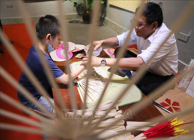 Giới thiệu và hướng dẫn trẻ em làm quạt. Ảnh: Thanh Tùng - TTXVN