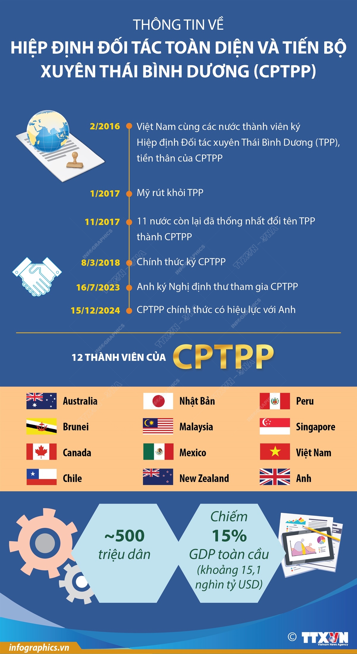 Hà Nội (TTXVN 15/12) Ngày 15/12/2024, Anh đã trở thành quốc gia châu Âu đầu tiên gia nhập Hiệp định Đối tác Toàn diện và Tiến bộ xuyên Thái Bình Dương (CPTPP). Đây là thỏa thuận thương mại lớn nhất của nước này thời hậu Brexit (Anh rời khỏi Liên minh châu Âu). Với việc gia nhập CPTPP, Anh chính thức trở thành thành viên thứ 12 của khối thương mại này. Được thành lập vào năm 2018 và đóng góp khoảng 15% GDP toàn cầu, CPTPP hiện quy tụ 2 thành viên của Nhóm các nước công nghiệp phát triển (G7) là Canada và Nhật Bản, cùng với Anh, Australia, New Zealand, Mexico, Peru, Chile, Singapore, Brunei, Malaysia và Việt Nam.