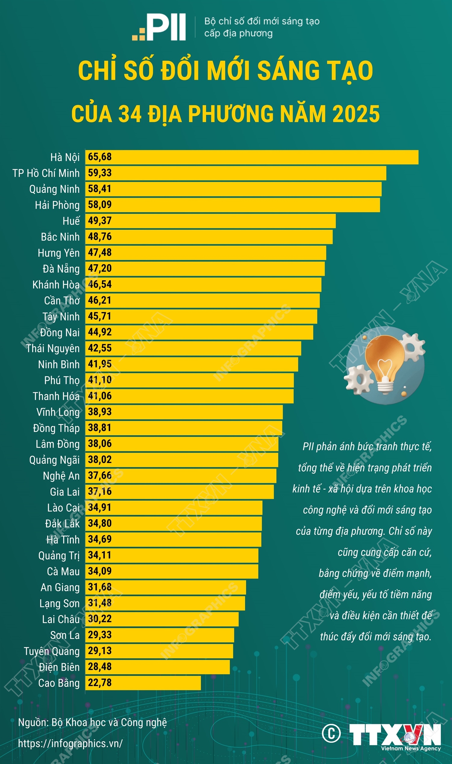 Hà Nội (TTXVN 1/10) Trong khuôn khổ Ngày hội Đổi mới sáng tạo quốc gia 2025, Bộ Khoa học và Công nghệ đã công bố Chỉ số đổi mới sáng tạo cấp địa phương (PII) năm 2025. PII phản ánh bức tranh thực tế, tổng thể về hiện trạng phát triển kinh tế - xã hội dựa trên khoa học công nghệ và đổi mới sáng tạo của từng địa phương. Chỉ số này cũng cung cấp căn cứ, bằng chứng về điểm mạnh, điểm yếu, yếu tố tiềm năng và điều kiện cần thiết để thúc đẩy đổi mới sáng tạo.