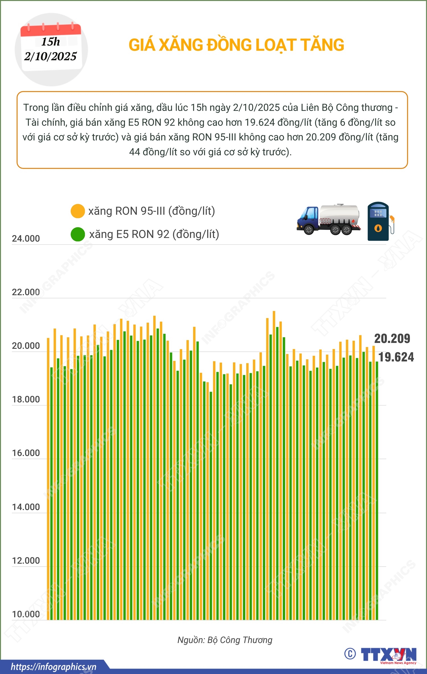 Hà Nội (TTXVN 2/10) Trong lần điều chỉnh giá xăng, dầu lúc 15h ngày 2/10/2025 của Liên Bộ Công thương - Tài chính; giá bán lẻ tối đa đối với các mặt hàng xăng được áp dụng: xăng E5 RON 92 không cao hơn 19.624 đồng/lít (tăng 6 đồng/lít so với giá cơ sở kỳ trước) và giá bán xăng RON 95-III không cao hơn 20.209 đồng/lít (tăng 44 đồng/lít so với giá cơ sở kỳ trước).