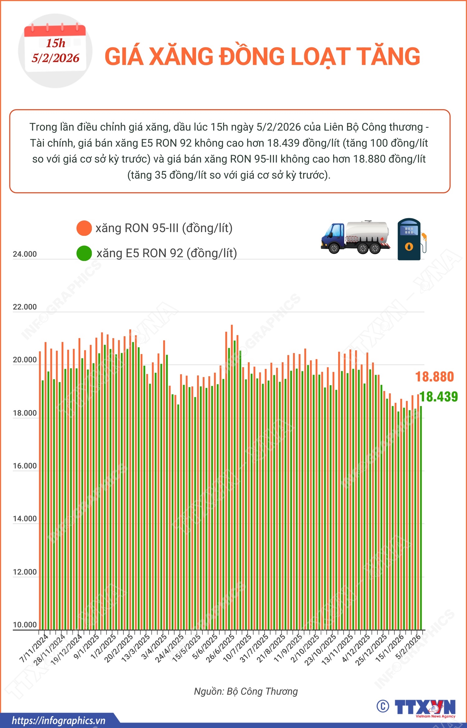 Hà Nội (TTXVN 5/2) Trong lần điều chỉnh giá xăng, dầu lúc 15h ngày 5/2/2026 của Liên Bộ Công thương - Tài chính, giá bán xăng E5 RON 92 không cao hơn 18.439 đồng/lít (tăng 100 đồng/lít so với giá cơ sở kỳ trước) và giá bán xăng RON 95-III không cao hơn 18.880 đồng/lít (tăng 35 đồng/lít so với giá cơ sở kỳ trước).