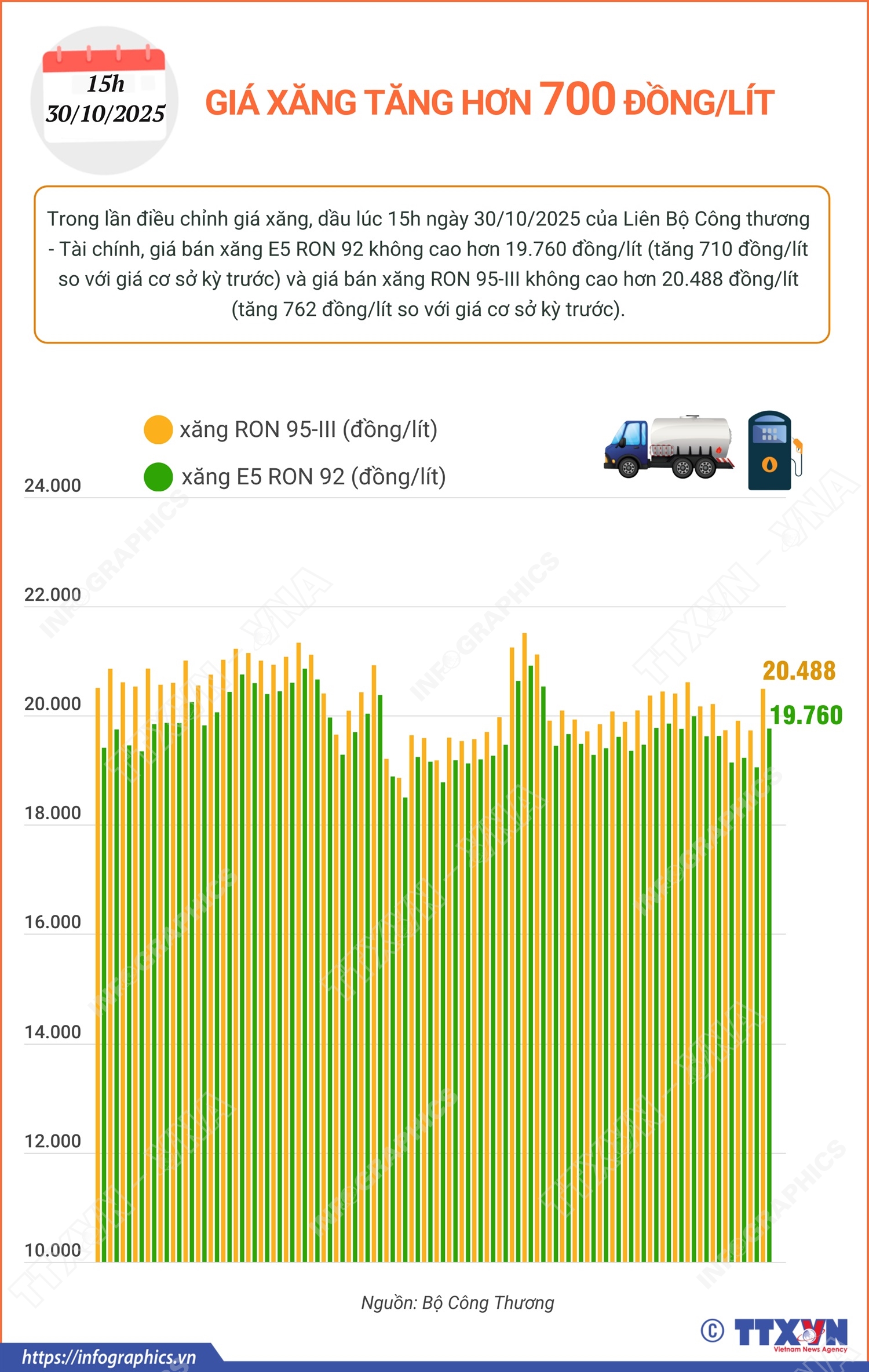 Hà Nội (TTXVN 30/10) Trong lần điều chỉnh giá xăng, dầu lúc 15h ngày 30/10/2025 của Liên Bộ Công thương - Tài chính, giá bán xăng E5 RON 92 không cao hơn 19.760 đồng/lít (tăng 710 đồng/lít so với giá cơ sở kỳ trước) và giá bán xăng RON 95-III không cao hơn 20.488 đồng/lít (tăng 762 đồng/lít so với giá cơ sở kỳ trước).