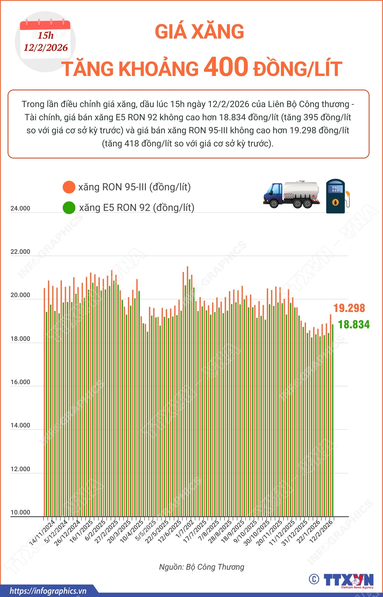 Hà Nội (TTXVN 12/2) Trong lần điều chỉnh giá xăng, dầu lúc 15h ngày 12/2/2026 của Liên Bộ Công thương - Tài chính, giá bán xăng E5 RON 92 không cao hơn 18.834 đồng/lít (tăng 395 đồng/lít so với giá cơ sở kỳ trước) và giá bán xăng RON 95-III không cao hơn 19.298 đồng/lít (tăng 418 đồng/lít so với giá cơ sở kỳ trước).