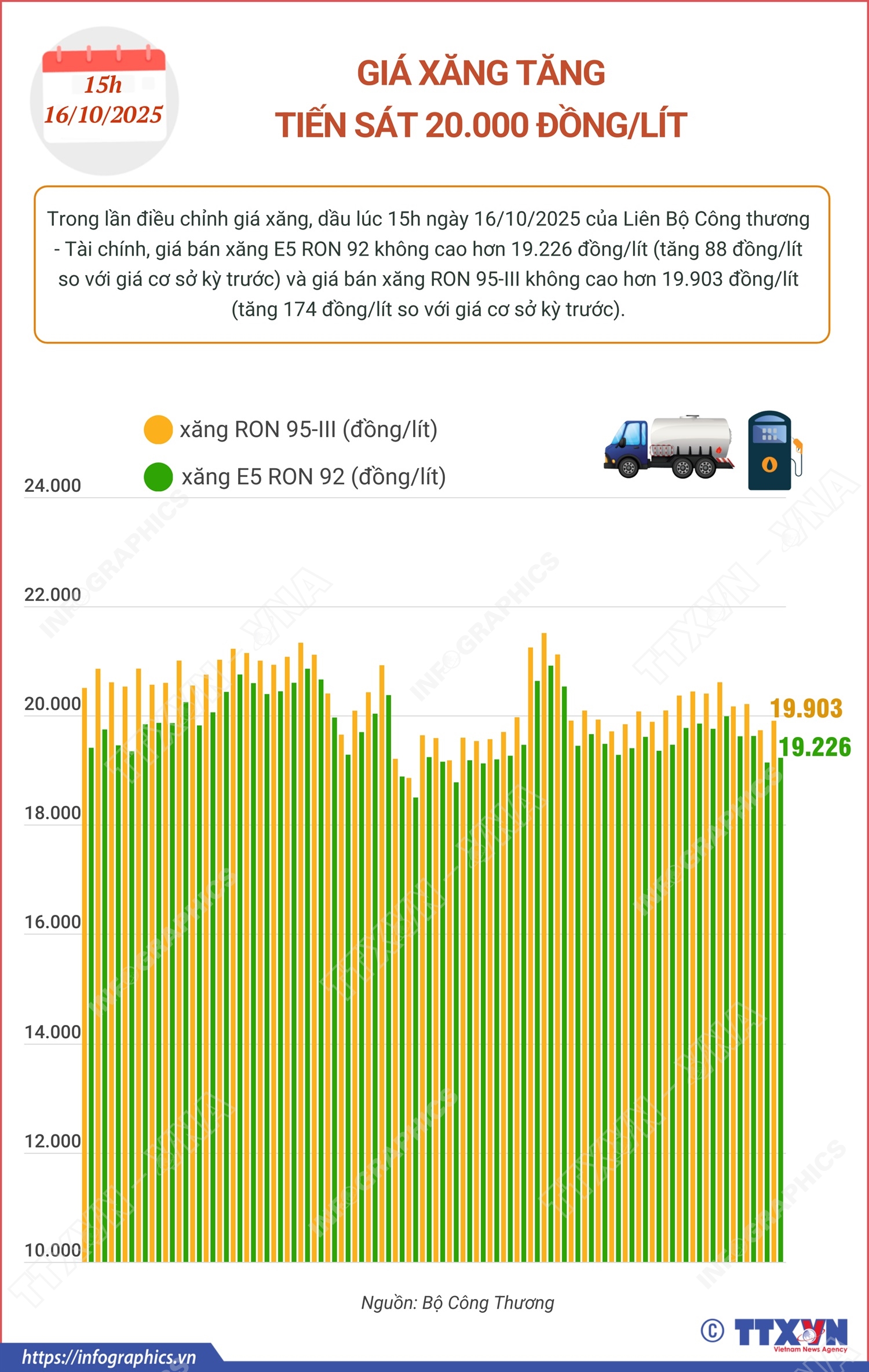 Hà Nội (TTXVN 16/10) Trong lần điều chỉnh giá xăng, dầu lúc 15h ngày 16/10/2025 của Liên Bộ Công thương - Tài chính, giá bán xăng E5 RON 92 không cao hơn 19.226 đồng/lít (tăng 88 đồng/lít so với giá cơ sở kỳ trước) và giá bán xăng RON 95-III không cao hơn 19.903 đồng/lít (tăng 174 đồng/lít so với giá cơ sở kỳ trước).