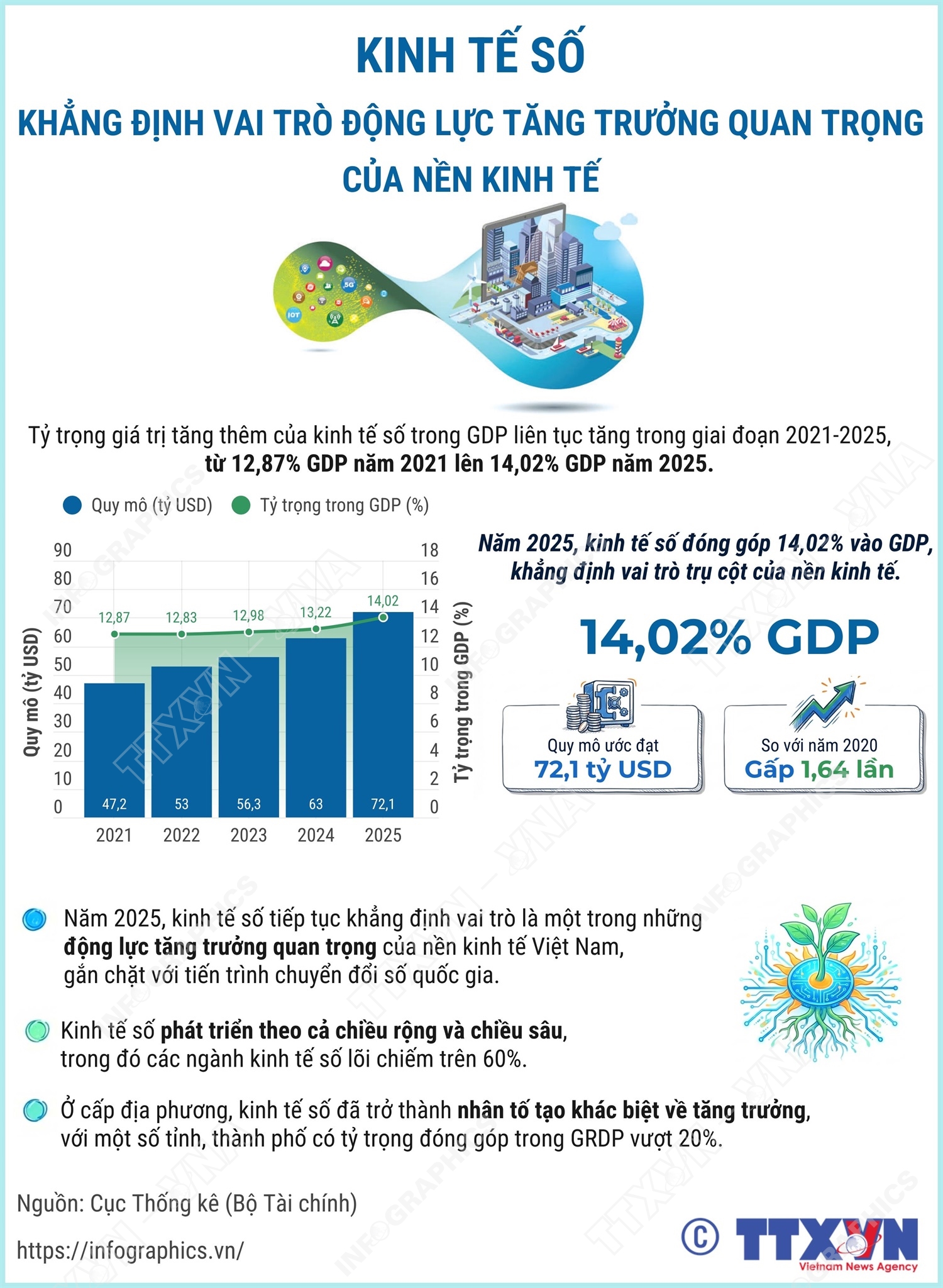 Hà Nội (TTXVN 18/1) Năm 2025, kinh tế số tiếp tục khẳng định vai trò là một trong những động lực tăng trưởng quan trọng của nền kinh tế Việt Nam, gắn chặt với tiến trình chuyển đổi số quốc gia. Tỷ trọng giá trị tăng thêm của kinh tế số trong GDP ước đạt 14,02%, tương đương khoảng 72,1 tỷ USD, tăng 1,64 lần so với năm 2020. Kinh tế số phát triển theo cả chiều rộng và chiều sâu, trong đó các ngành kinh tế số lõi chiếm trên 60%, đồng thời mức độ số hóa trong các ngành, lĩnh vực ngày càng được mở rộng, đặc biệt là thương mại, tài chính, dịch vụ hành chính và hạ tầng năng lượng. Ở cấp địa phương, kinh tế số đã trở thành nhân tố tạo khác biệt về tăng trưởng, với một số tỉnh, thành phố có tỷ trọng đóng góp trong GRDP vượt 20%. Những kết quả này phản ánh hiệu quả bước đầu của Chiến lược chuyển đổi số quốc gia, vai trò dẫn dắt của Chính phủ số và nỗ lực đồng bộ của các cấp, các ngành, doanh nghiệp và người dân trong phát triển kinh tế số và xã hội số.