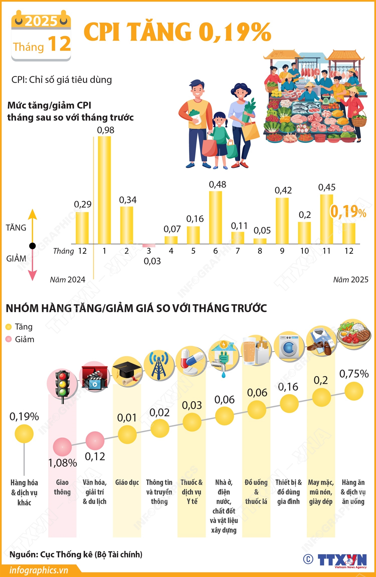 Đồ họa Tháng 12 năm 2025: CPI tăng 0,19% Hà Nội (TTXVN 5/1) Chỉ số giá tiêu dùng (CPI) tháng 12/2025 tăng 0,19% so với tháng trước. Có 9 nhóm hàng hóa và dịch vụ có chỉ số giá tăng và 2 nhóm hàng hóa và dịch vụ có chỉ số giá giảm. Ngày:05/01/2026 19:26 Định dạng:.jpg Chuyên mục:Kinh tế Tải về: Từ khóa:Chỉ số giá tiêu dùng, CPI Chia sẻ:Plugin Social