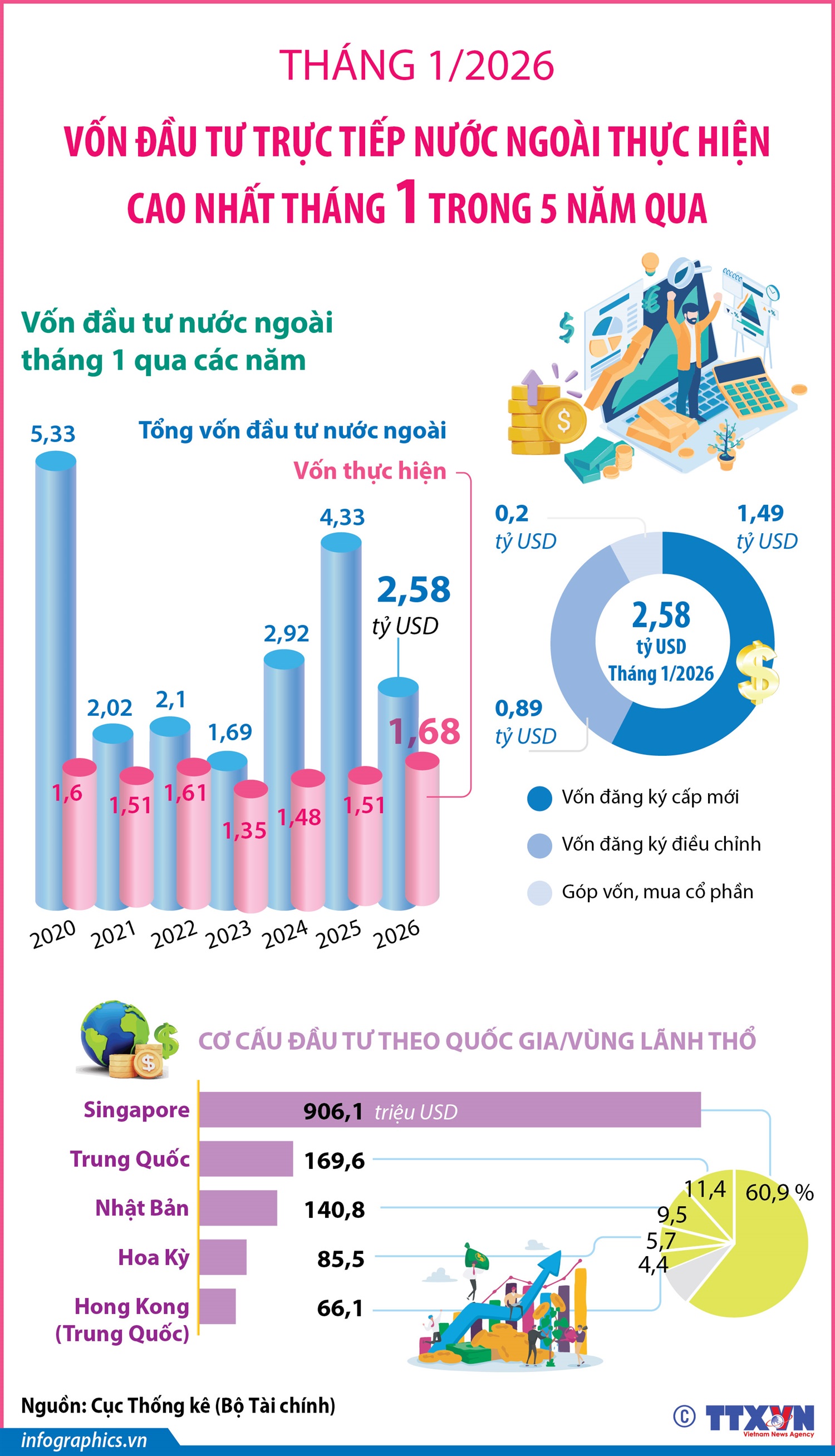 Hà Nội (TTXVN 9/2) Tổng vốn đầu tư nước ngoài đăng ký vào Việt Nam tính đến ngày 31/1/2026 bao gồm: Vốn đăng ký cấp mới, vốn đăng ký điều chỉnh và giá trị góp vốn, mua cổ phần của nhà đầu tư nước ngoài đạt 2,58 tỷ USD, giảm 40,6% so với cùng kỳ năm trước. Trong khi đó, vốn đầu tư trực tiếp nước ngoài thực hiện tại Việt Nam tháng 1/2026 ước đạt 1,68 tỷ USD, tăng 11,3% so với cùng kỳ năm trước. Đây là số vốn đầu tư trực tiếp nước ngoài thực hiện cao nhất tháng Một trong 5 năm qua.