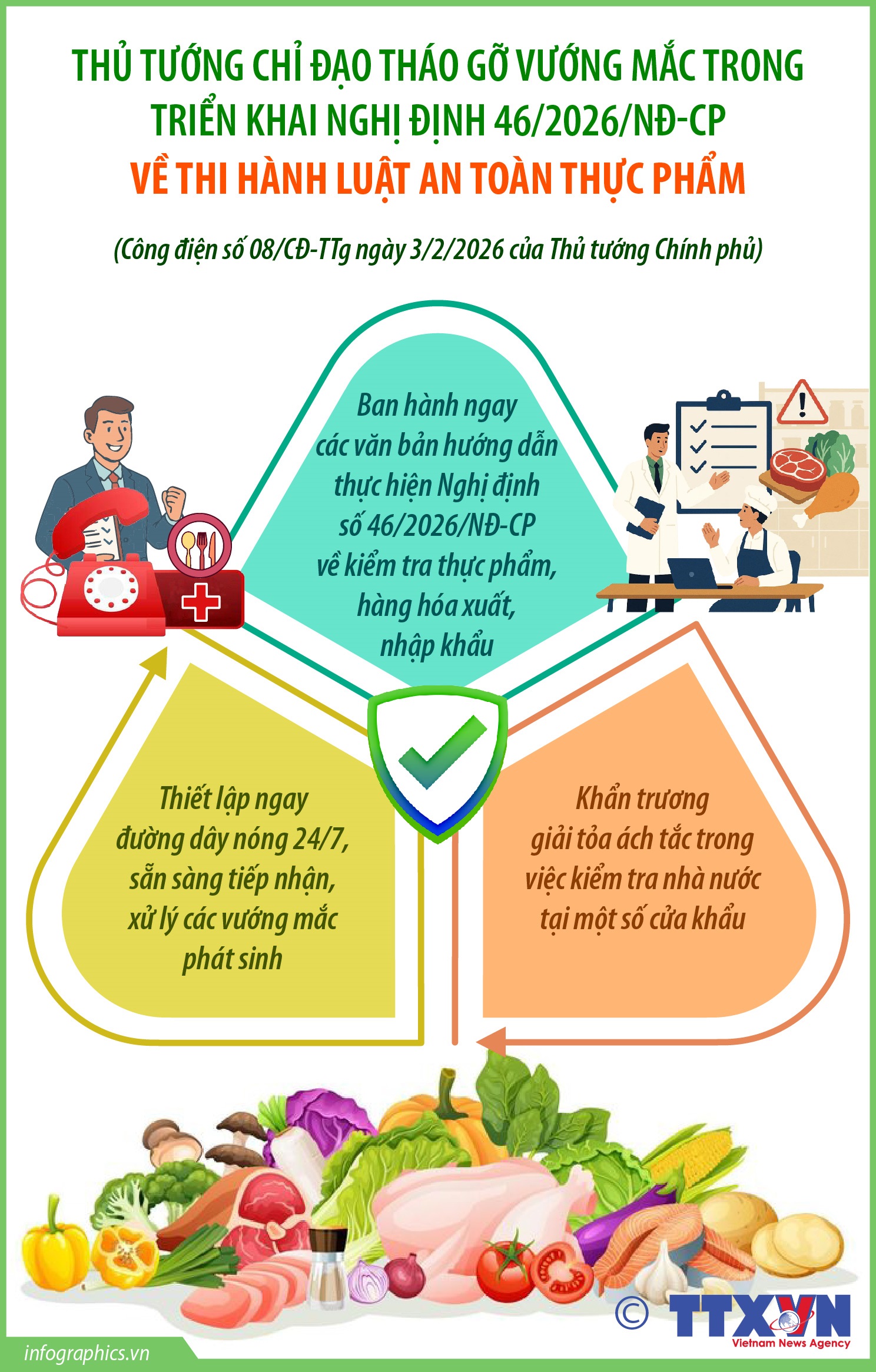 Hà Nội (TTXVN 4/2) Thủ tướng Chính phủ Phạm Minh Chính vừa ký Công điện số 08/CĐ-TTg ngày 3/2/2026 về việc tập trung tháo gỡ khó khăn, vướng mắc trong tổ chức triển khai thực hiện Nghị định số 46/2026/NĐ-CP của Chính phủ quy định chi tiết thi hành một số điều và biện pháp để tổ chức, hướng dẫn thi hành Luật An toàn thực phẩm.