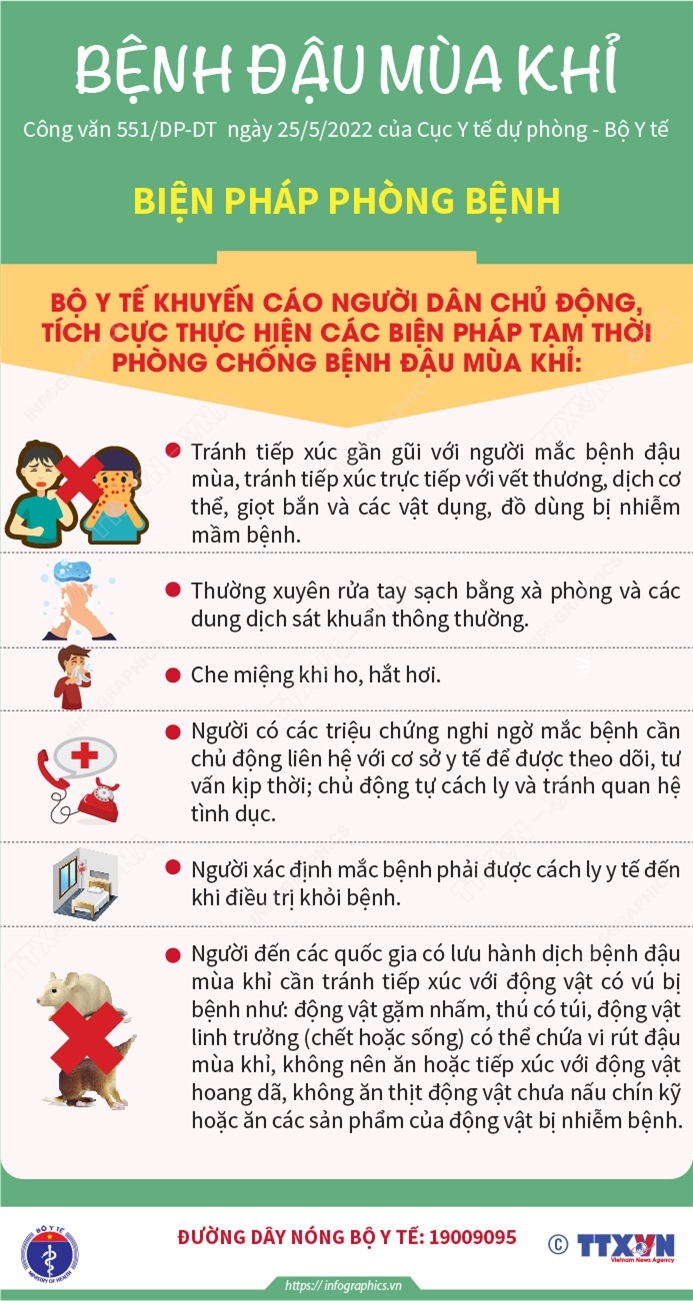 Hà Nội (TTXVN 29/5) Bộ Y tế khuyến cáo người dân chủ động, tích cực thực hiện các biện pháp tạm thời phòng chống bệnh Đậu mùa khỉ như: Tránh tiếp xúc gần gũi với người mắc bệnh đậu mùa, tránh tiếp xúc trực tiếp với vết thương, dịch cơ thể, giọt bắn và các vật dụng, đồ dùng bị nhiễm mầm bệnh thường xuyên rửa tay sạch bằng xà phòng và các dung dịch sát khuẩn thông thường…