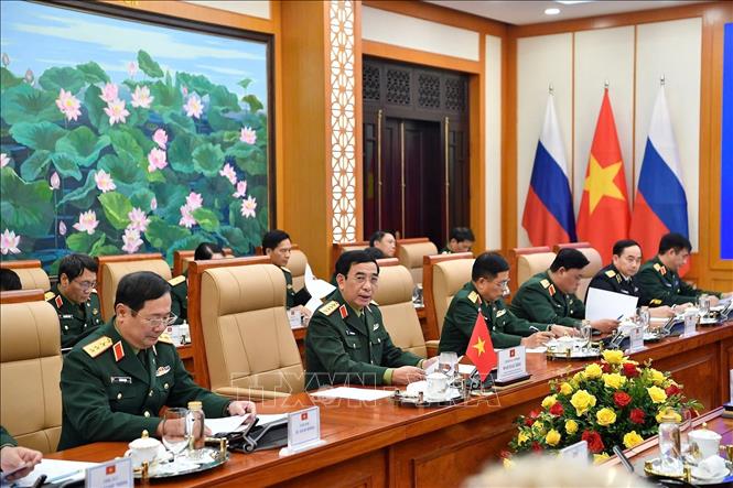 Đại tướng Phan Văn Giang, Bộ trưởng Bộ Quốc phòng và các thành viên đoàn Việt Nam tại cuộc hội kiến. Ảnh: TTXVN phát