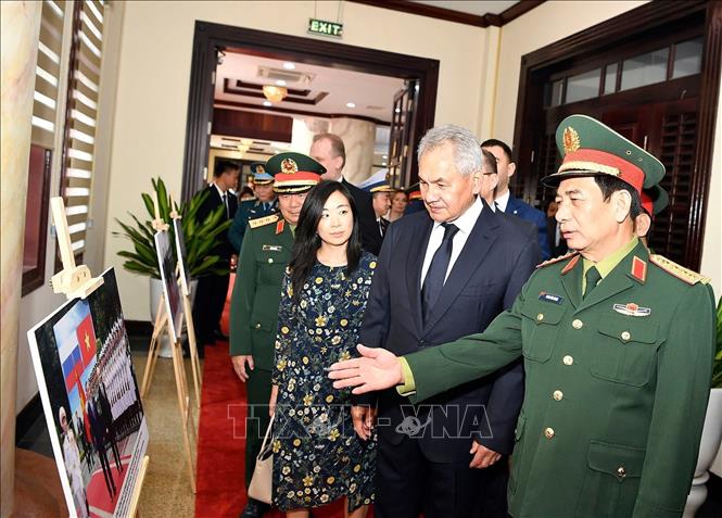 Đại tướng Phan Văn Giang, Bộ trưởng Bộ Quốc phòng Việt Nam và Đại tướng Sergei Shoigu, Thư ký Hội đồng An ninh Liên bang Nga xem trưng bày ảnh về quan hệ hai nước. Ảnh: TTXVN phát