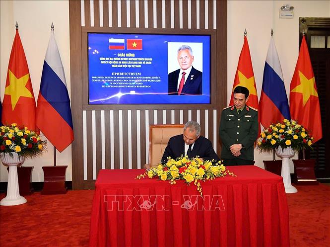 Đại tướng Sergei Shoigu, Thư ký Hội đồng An ninh Liên bang Nga ghi sổ lưu niệm. Ảnh: TTXVN phát