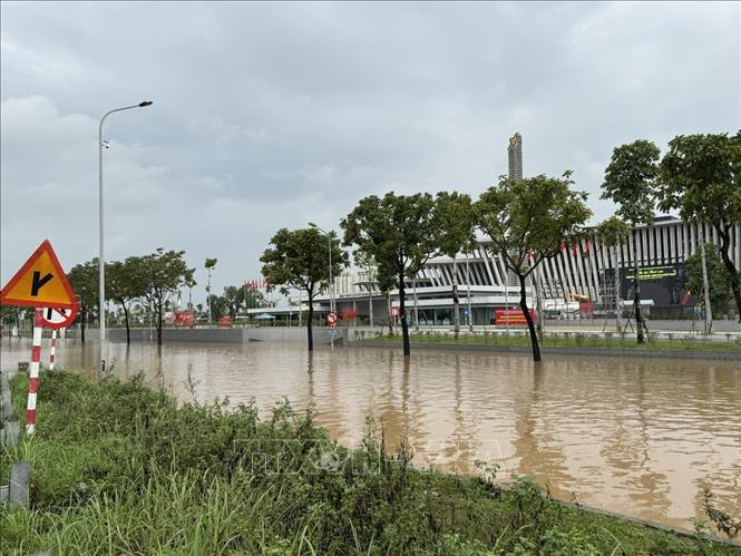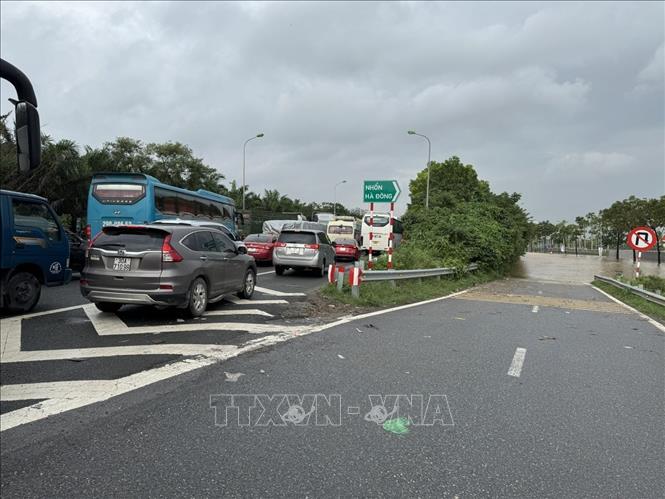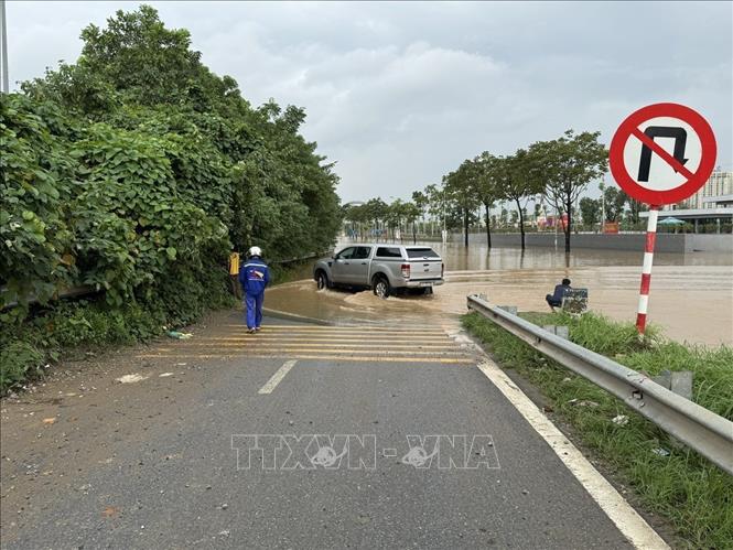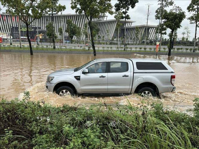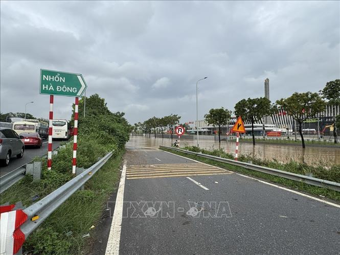 Đường gom Đại lộ Thăng Long bị ngập sâu. Ảnh: Quốc Lũy - TTXVN