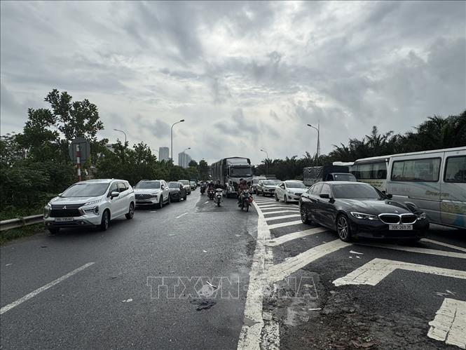 Nước ngập đường gom khiến các phương tiện tràn lên đường cao tốc. Ảnh: Quốc Lũy - TTXVN