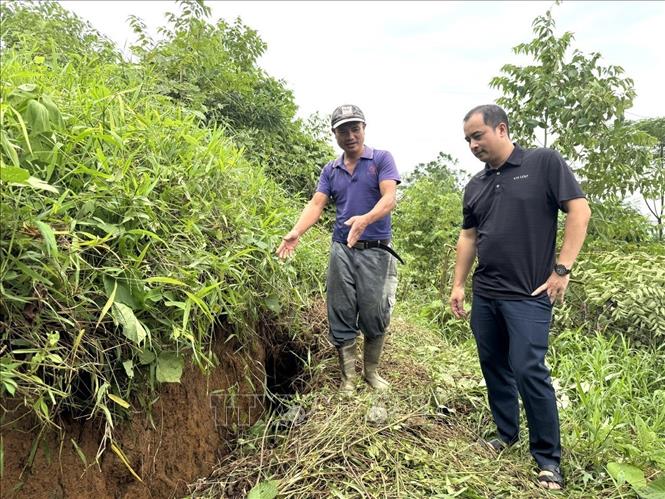 Hình ảnh vết nứt trên sườn núi tại thôn 9, xóm Xẩm, xã Suối Hai. Ảnh: Quốc Lũy - TTXVN