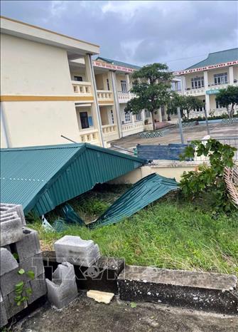 Trường tiểu học Quan Lạn, Quảng Ninh, bị tốc mái nhà để xe. Ảnh: TTXVN phát