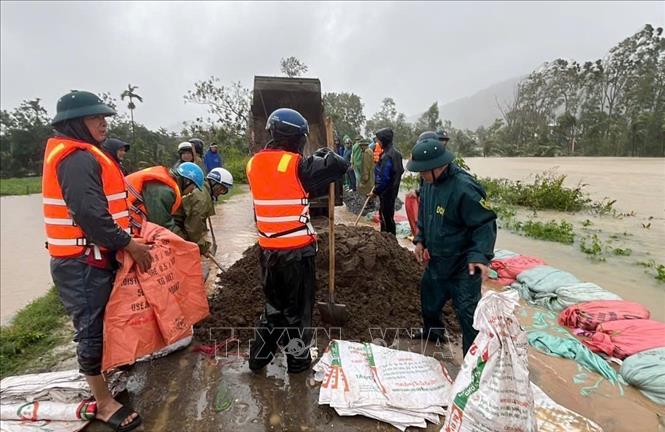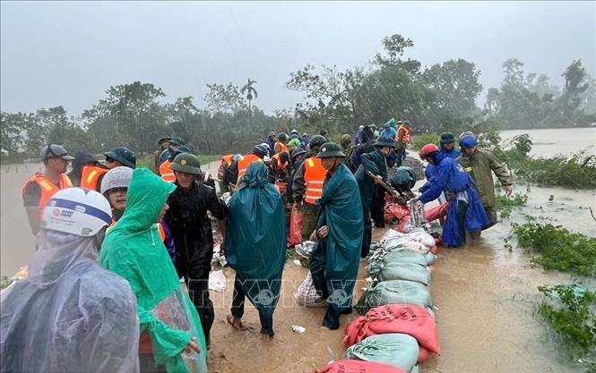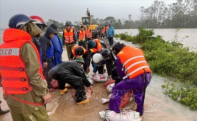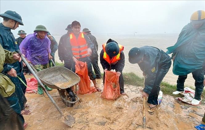 Do mưa lớn do ảnh hưởng bão số 10 và việc xả lũ hồ Yên Mỹ làm triều cường dâng, mực nước đê sông Thị Long dâng cao khiến hơn 500m đã tràn qua đê đe dọa sự an toàn của 1.714 hộ dân. UBND phường Ngọc Sơn (Thanh Hóa) đã huy động gần 300 người gồm lực lượng bộ đội, công an, chính quyền địa phương triển khai xử lý tràn đê từ 6 giờ sáng tới thời điểm hiện tại. Ngoài ra, huy động 40 phương tiện ô tô chở đá bây, cát cho vào bao tải gia cố đê và triển khai phương án đóng cọc tre chống sạt lở, gia cố không cho nước tràn qua đê. Ảnh: Việt Hoàng - TTXVN
