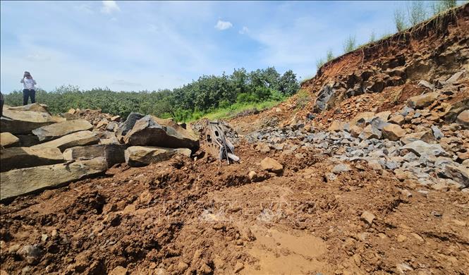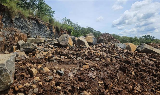[23/10/2025 09:00:25] Mặc dù đã bị chính quyền địa phương xử phạt về hành vi san lấp, cải tạo đất làm thay đổi hiện trạng nhưng công trường khai thác đá ở xã Phú Trung (Đồng Nai) lại tiếp tục hoạt động với quy mô lớn hơn. Hàng trăm khối đá được khai thác và vận chuyển ra ngoài dù chỉ nằm cách trụ sở Ủy ban xã chưa đầy 3km. Ảnh: TTXVN