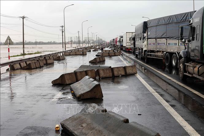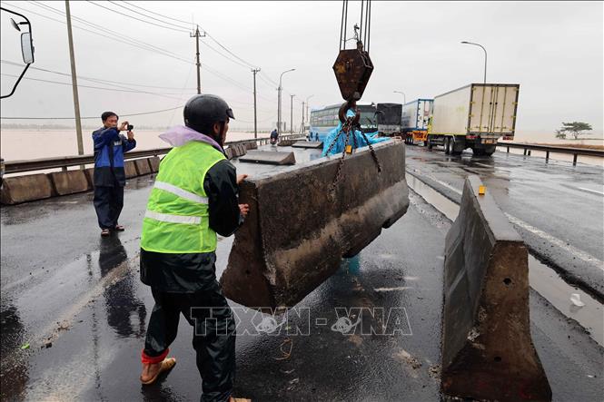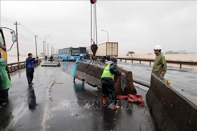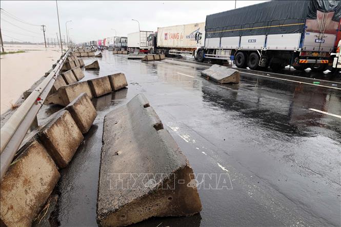 Nỗ lực khắc phục giải phân cách cứng bị trôi dạt trên Quốc lộ 1A. Ảnh: Phạm Kha – TTXVN