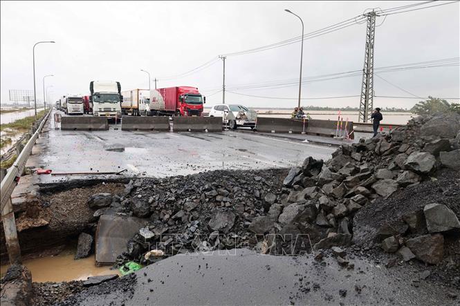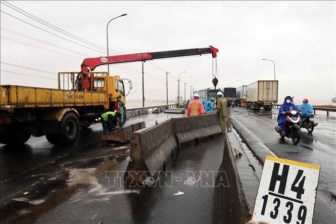 Nỗ lực khắc phục giải phân cách cứng bị trôi dạt trên Quốc lộ 1A. Ảnh: Đỗ Trưởng - TTXVN