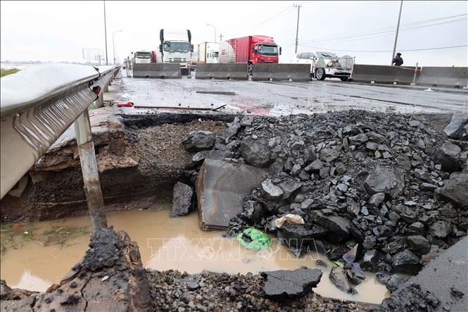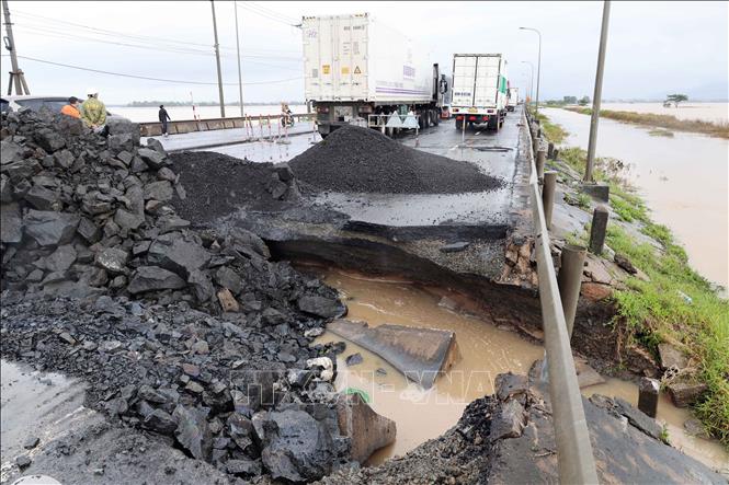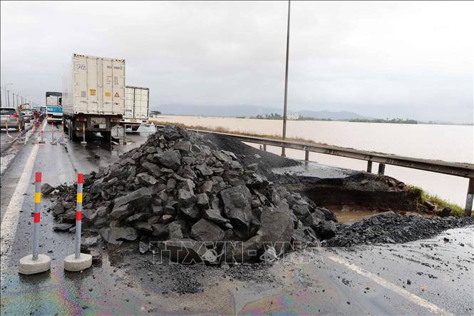 Quốc lộ 1A qua địa bàn phường Phú Yên (Đắk Lắk) có vị trí bị xói lở nghiêm trọng, ảnh hưởng đến việc đi lại của các phương tiện. Ảnh: Đỗ Trưởng – TTXVN