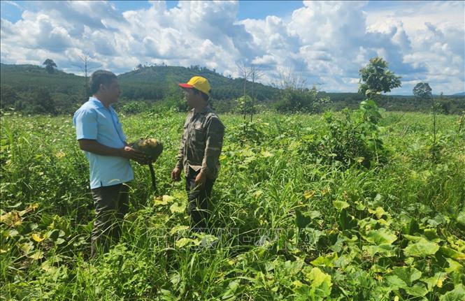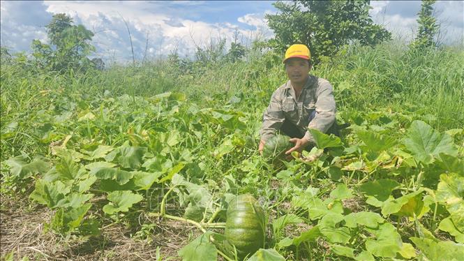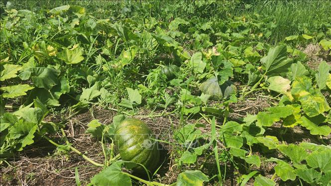 Nông dân xã biên giới Ia O, huyện Ia Grai, tỉnh Gia Lai, đang bước vào vụ thu hoạch bí đỏ trên diện tích cao su tái canh. Năm nay, do mưa trái mùa xuất hiện đúng thời điểm cây ra hoa, năng suất bí đỏ giảm rõ rệt, trong khi giá thu mua chỉ dao động 3.000–4.000 đồng/kg, thấp hơn nhiều so với các năm trước khiến nhiều hộ gia đình gặp khó khăn trong cân đối chi phí, đặc biệt là các hộ mới đầu tư trồng theo phong trào. Ảnh: Hồng Điệp - TTXVN