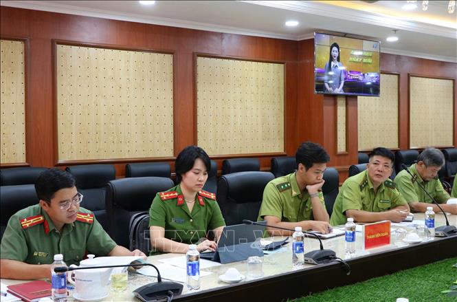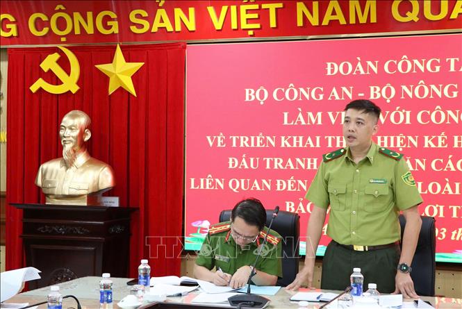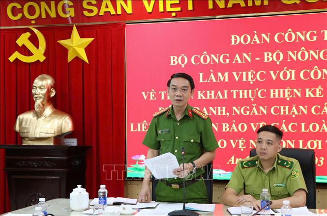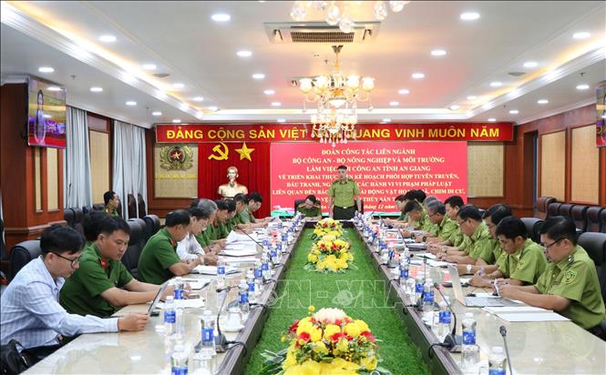 Ngày 3/12/2025, Đoàn công tác liên ngành gồm Bộ Công an, Bộ Nông nghiệp và Môi trường do đồng chí Hà Hải Bình, Phó Cục trưởng Cục Lâm nghiệp và Kiểm lâm làm Trưởng đoàn, đã có buổi làm việc với Công an tỉnh An Giang về việc triển khai kế hoạch phối hợp tuyên truyền, đấu tranh, phòng ngừa và ngăn chặn các hành vi vi phạm pháp luật trong lĩnh vực bảo vệ động vật hoang dã, chim di cư và bảo vệ nguồn lợi thủy sản tại Việt Nam. Ảnh: Văn Sĩ - TTXVN