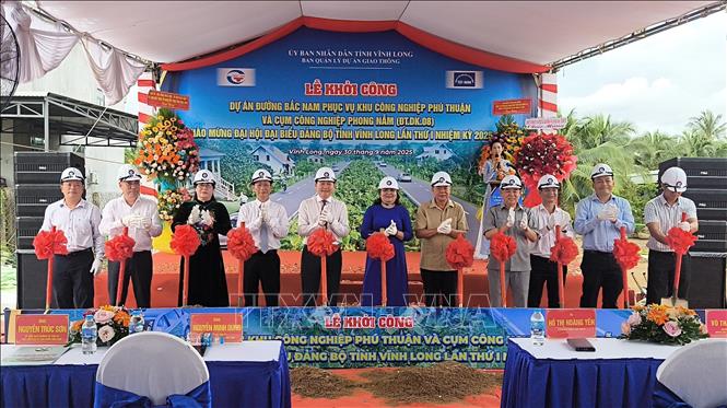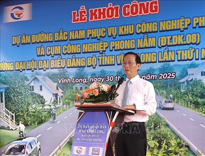 [30/09/2025 17:41:26] Ngày 30/9, tỉnh Vĩnh Long tổ chức lễ khởi công Dự án Đường Bắc Nam phục vụ Khu công nghiệp (KCN) Phú Thuận và Cụm công nghiệp (CCN) Phong Nẫm (tuyến ĐT.DK.08) trên địa bàn xã Phú Thuận, tỉnh Vĩnh Long. Công trình chào mừng Đại hội đại biểu Đảng bộ tỉnh Vĩnh Long lần thứ nhất, nhiệm kỳ 2025 - 2030. Ảnh: Huỳnh Phúc Hậu - TTXVN