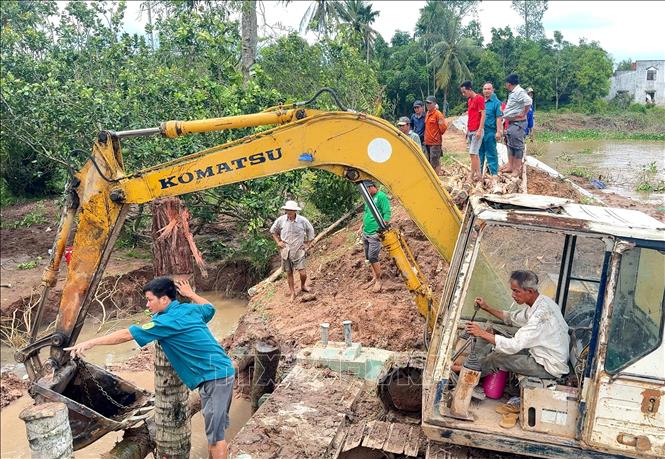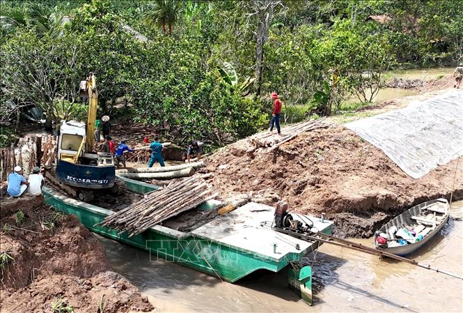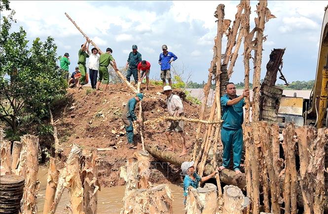 Cồn Thanh Long tại xã Quới Thiện, tỉnh Vĩnh Long là khu vực thường xuyên xảy ra sạt lở. Theo người dân sinh sống tại đây, chỉ trong vòng một tháng, tuyến đê bao nơi đây đã sạt lở đến 3 lần. Mới đây, trong con nước triều cường đầu tháng 9 âm lịch, đê bao tiếp tục sạt lở một đoạn hơn 15cm, nước từ sông Cổ Chiên tràn vào bên trong gây ngập các vườn cây ăn trái và nhà ở. Ảnh: Lê Thúy Hằng – TTXVN.