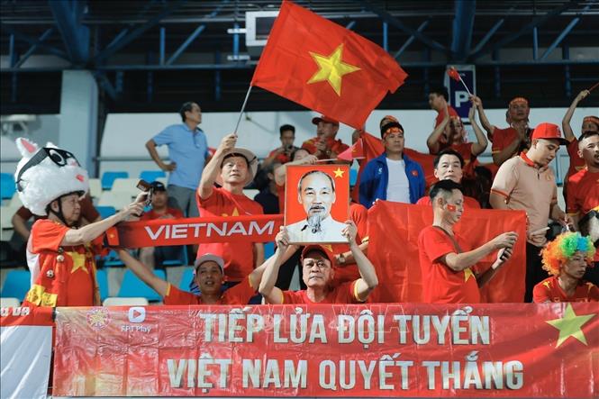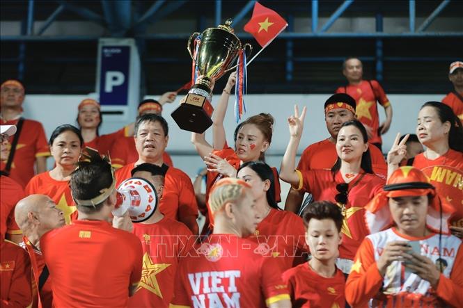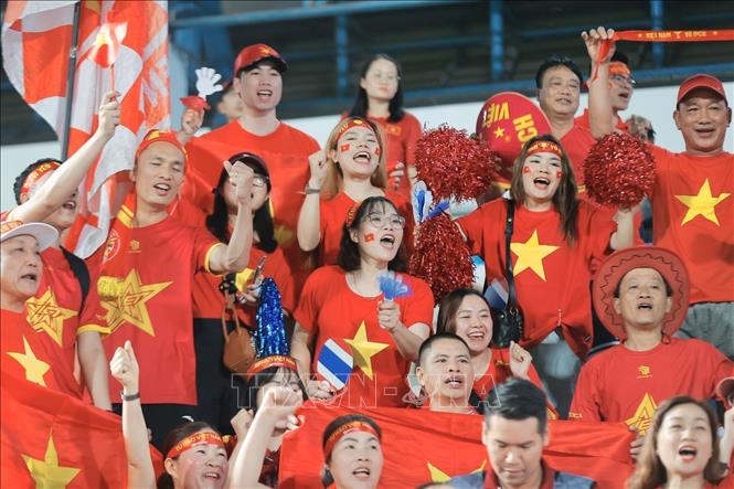 Các cổ động viên nhiệt thành của tuyển nữ Việt Nam trên sân Chonburi (Thái Lan). Ảnh: Minh Quyết - PV TTXVN tại Thái Lan