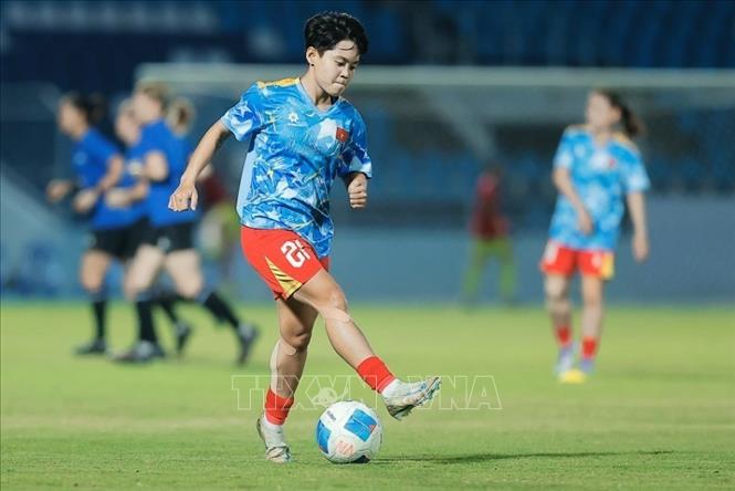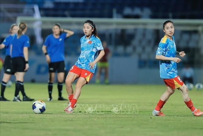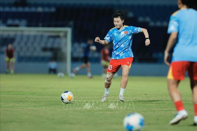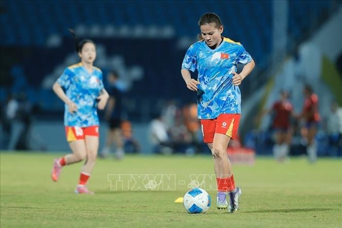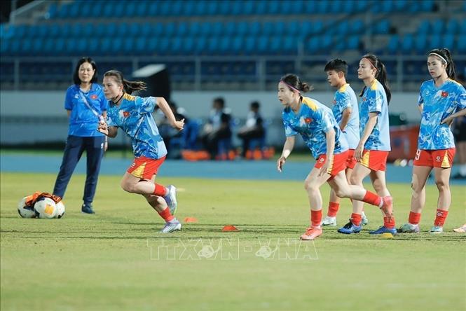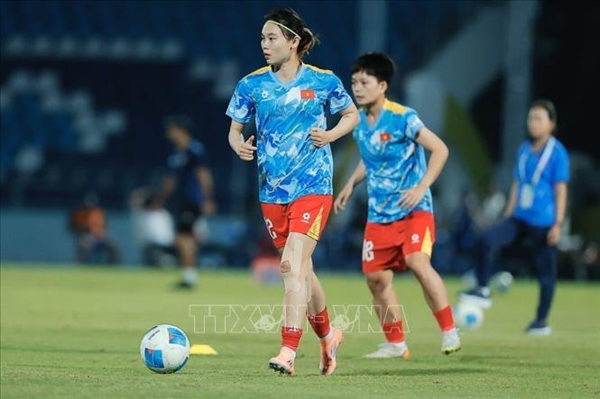 Các cầu thủ nữ Việt Nam khởi động trước trận đấu. Ảnh: Minh Quyết - PV TTXVN tại Thái Lan
