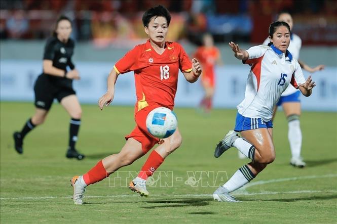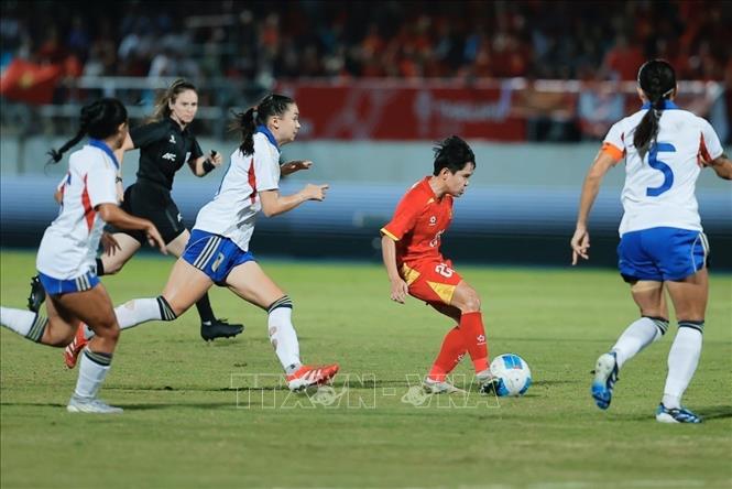 Thái Thị Thảo giữa vòng vây của 2 hậu vệ nữ Philippines. Ảnh: Minh Quyết - PV TTXVN tại Thái Lan