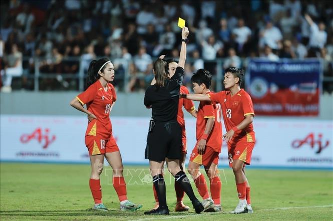 Vạn Sự (21) nhận thẻ vàng vì phạm lỗi với thủ môn của nữ Philippines. Ảnh: Minh Quyết - PV TTXVN tại Thái Lan