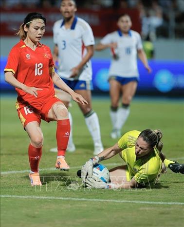 Thủ môn đội tuyển nữ Philippines bắt bóng ngay trước chân của Phạm Hải Yến. Ảnh: Minh Quyết - PV TTXVN tại Thái Lan