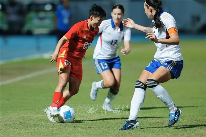 Thể hình cao to giúp các hậu vệ nữ Philippines chống đỡ hiệu quả các pha treo bóng bổng của cầu thủ nữ Việt Nam vào vòng cấm địa. Ảnh: Minh Quyết - PV TTXVN tại Thái Lan
