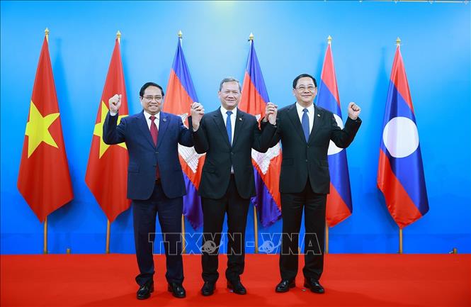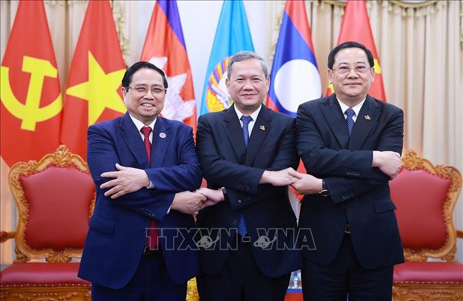 Thủ tướng Phạm Minh Chính và Thủ tướng Vương quốc Campuchia Hun Manet cùng Thủ tướng Lào Sonexay Siphandone tại cuộc gặp Thủ tướng ba nước. Ảnh: Dương Giang-TTXVN