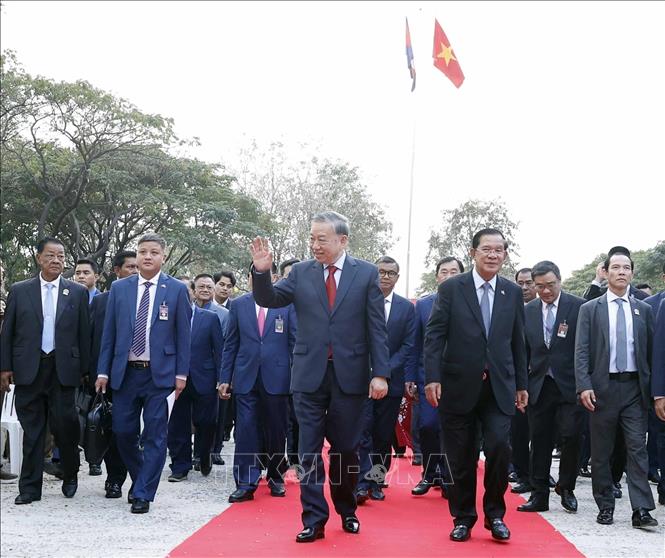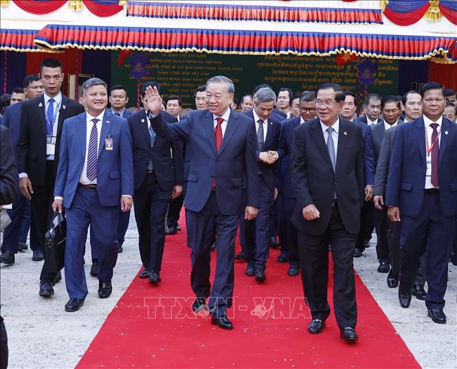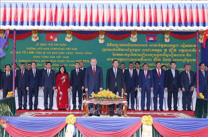 Tổng Bí thư Tô Lâm và Chủ tịch Đảng Nhân dân Campuchia, Chủ tịch Thượng viện Campuchia Samdech Techo Hun Sen đến dự Lễ động thổ Trường Hữu nghị Campuchia - Việt Nam. Ảnh: Thống Nhất – TTXVN